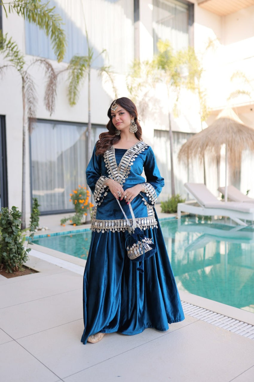 Experience regal sophistication with this Arabian Blue Ice Velvet Suit Set, beautifully crafted with rich zari embroidery and real mirror work. The deep blue hue paired with luxurious velvet creates a striking statement, perfect for festive evenings, weddings, and grand celebrations.