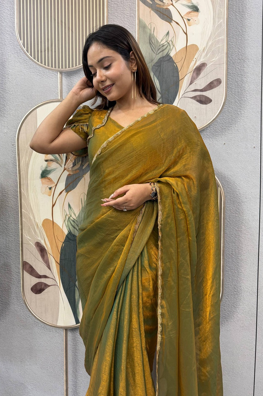 Make a bold yet elegant statement with this stunning Bronze Color Space Silk Gown Saree, crafted for women who love rich, earthy tones with a royal touch. The glowing bronze shade paired with refined beads lace and latkan detailing brings timeless charm to festive and wedding looks.