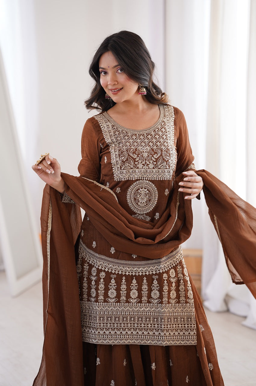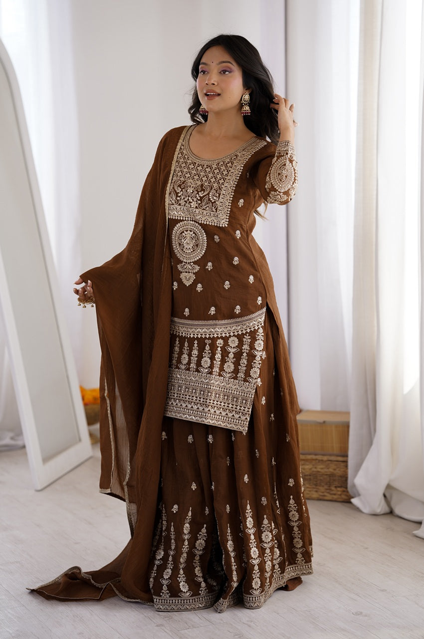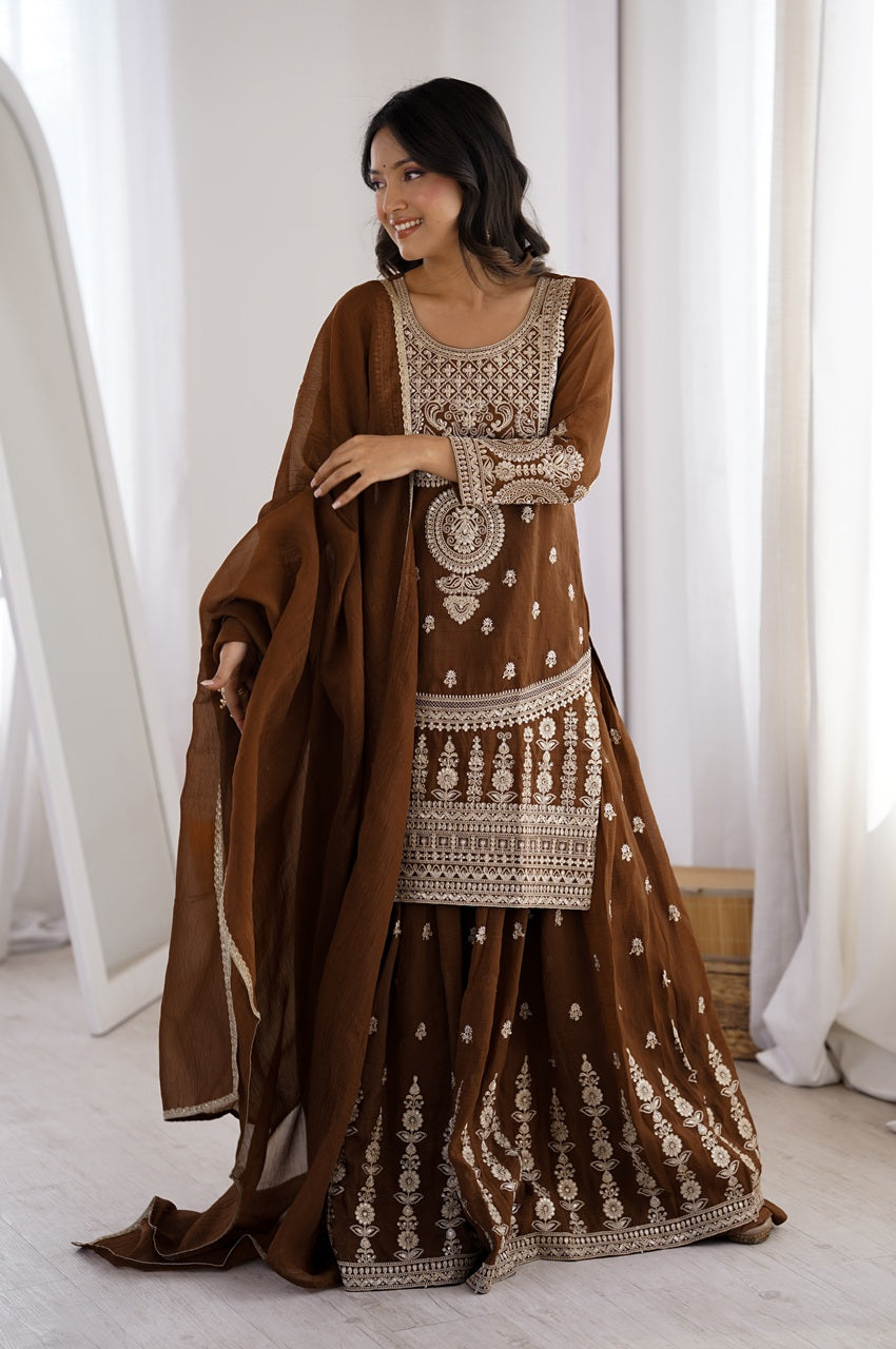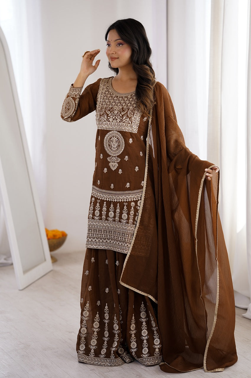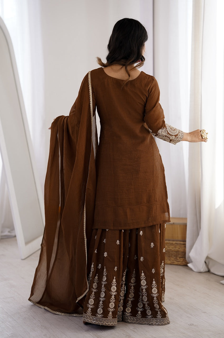 Style this brown sharara set with statement gold jewelry, embroidered heels, and a sleek clutch for a luxurious wedding or festive look.