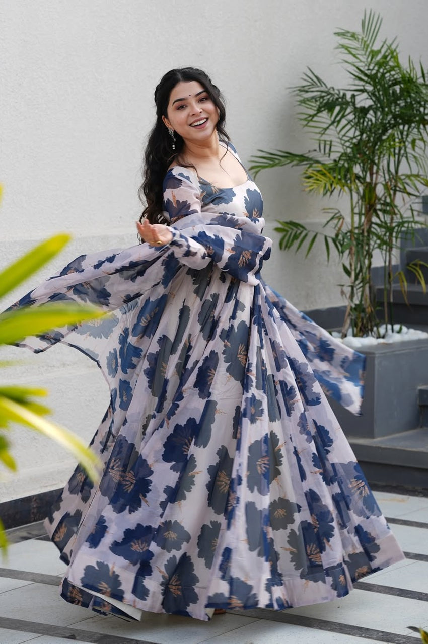 💖 The Cream Floral Tabby Organza Anarkali Suit blends soft tones with timeless prints, making it a graceful choice for those who love understated yet festive fashion.