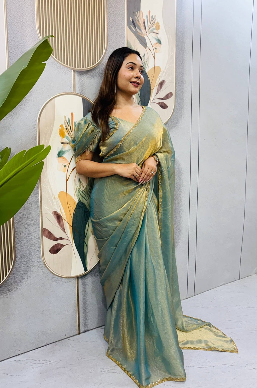 Step into understated luxury with this Dusty Olive Space Silk Gown Saree, designed for effortless elegance and refined charm. The muted olive tone paired with delicate beads lace and latkan detailing makes this ensemble a perfect blend of sophistication and modern ethnic style.