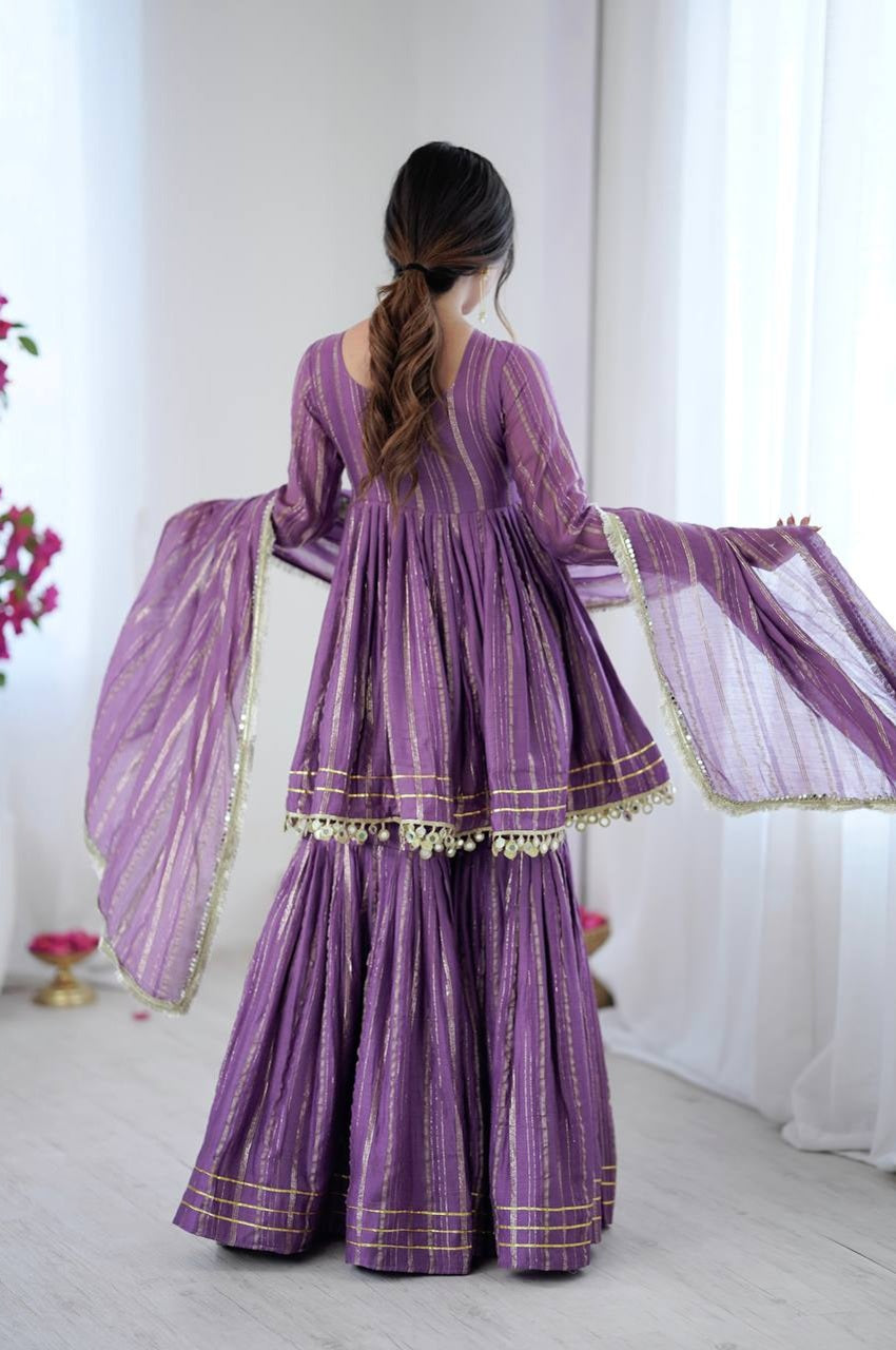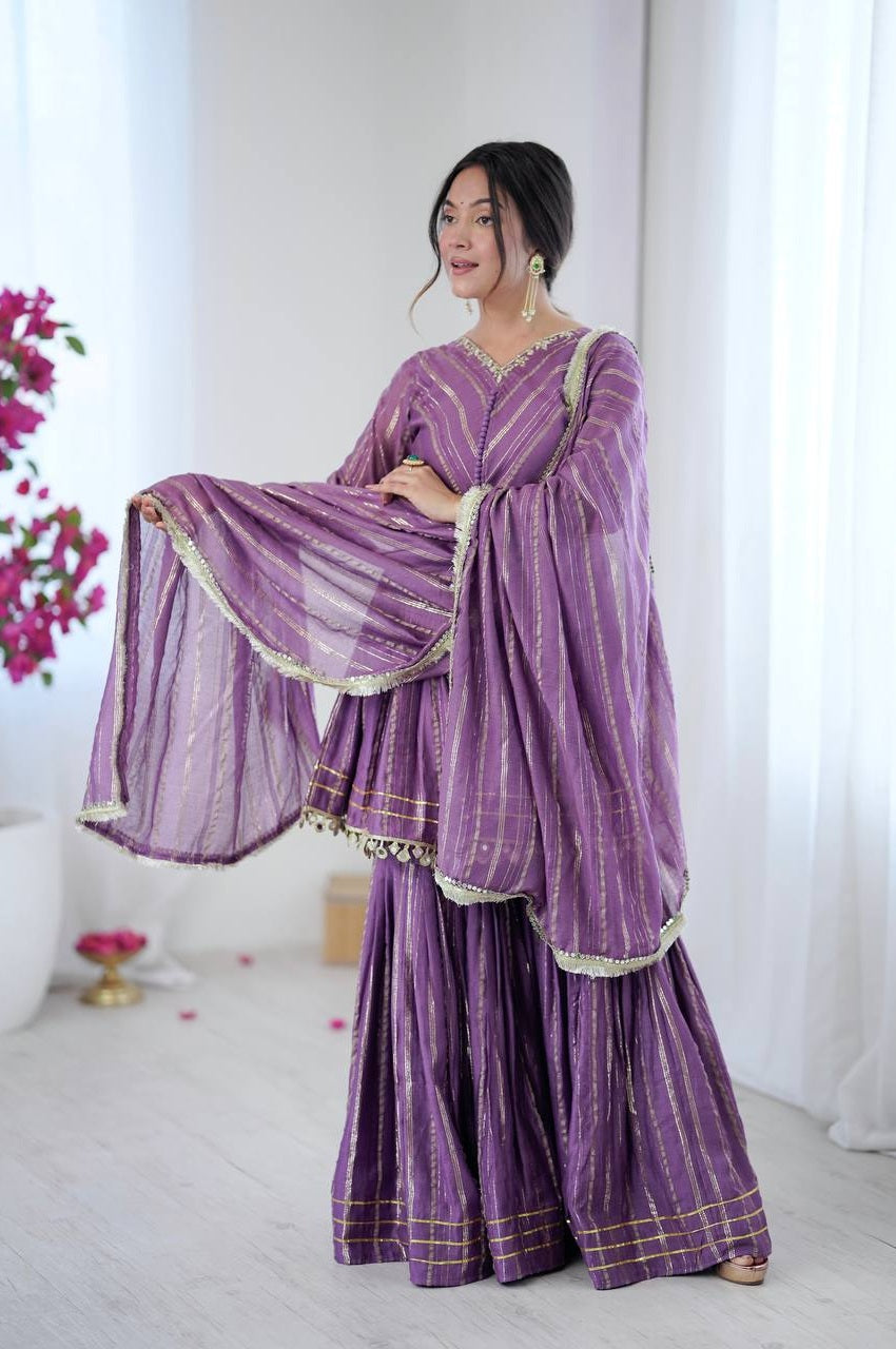 Bring timeless elegance to your festive wardrobe with this Lilac Mal Chanderi Sharara Set. Designed for effortless grace and comfort, this ensemble blends classic charm with modern sophistication — perfect for poojas, festivals, weddings, and family gatherings.