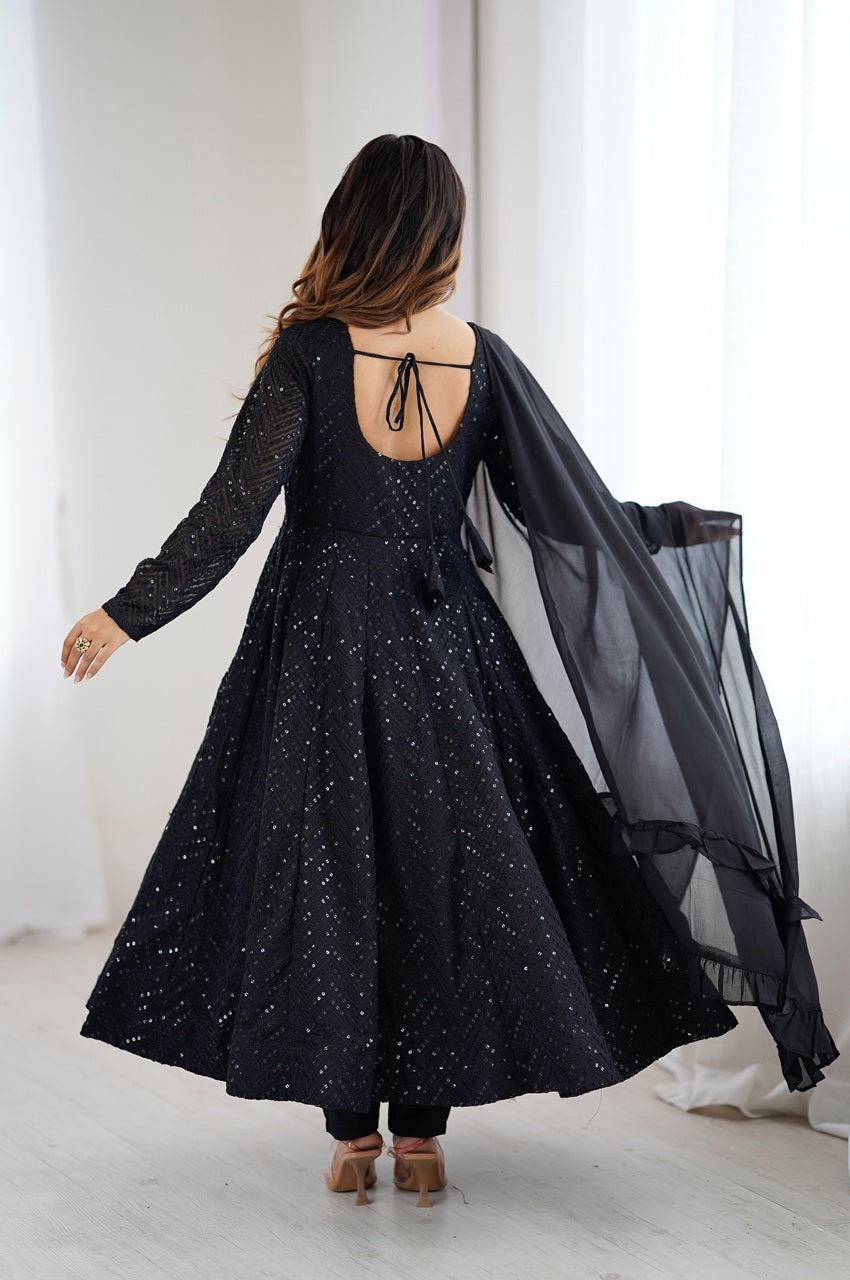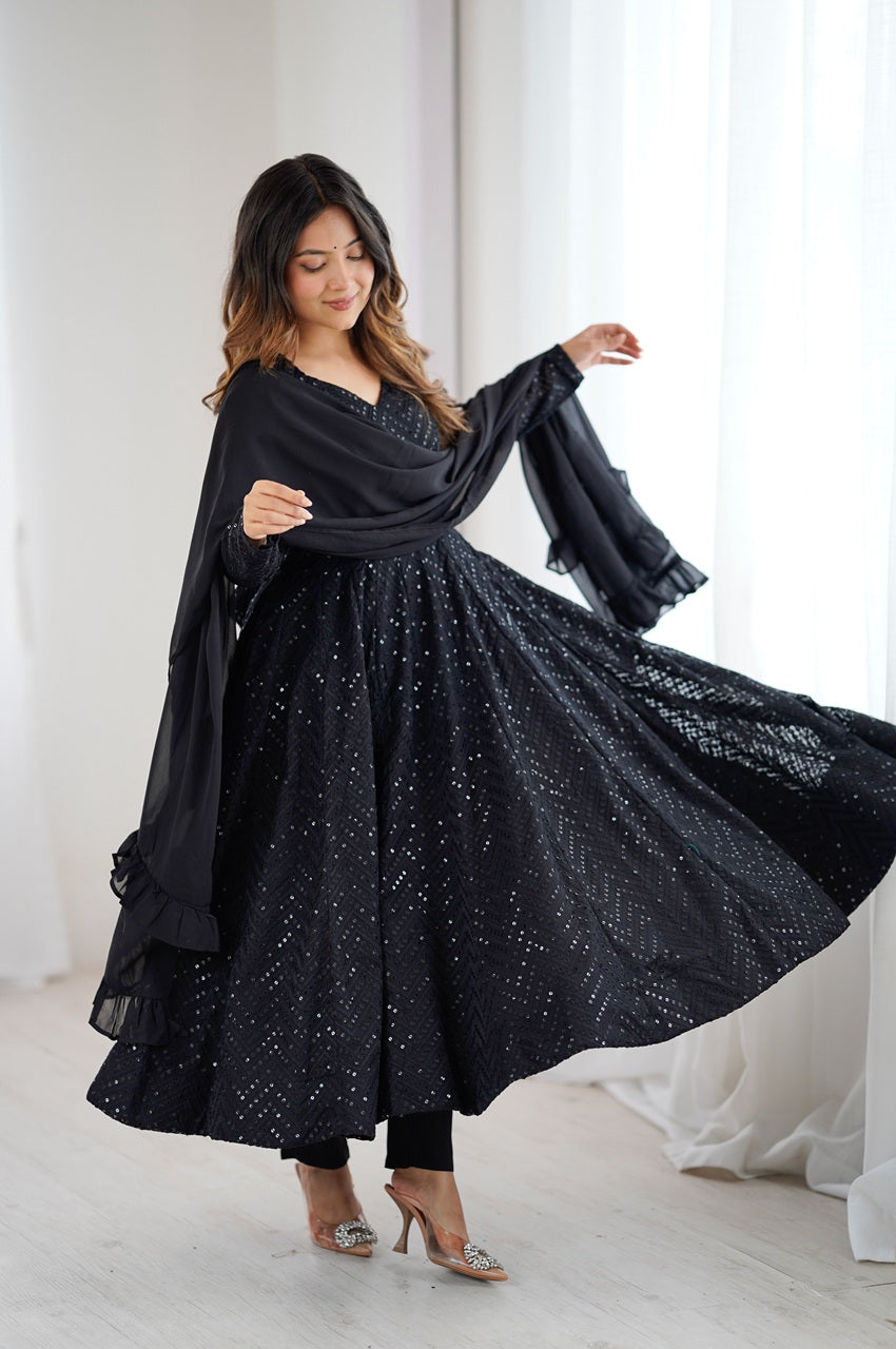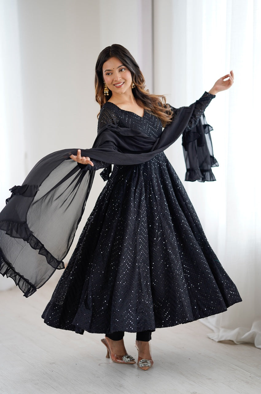 Embrace understated luxury with this Black Lucknowi Anarkali Suit Set. Beautifully crafted in heavy soft fox georgette and adorned with intricate Lucknowi thread and sequin work, this set features a flattering 4-meter flair and a trendy ruffle dupatta. It’s the ultimate choice for those who love "Nawabi" elegance with a modern twist.