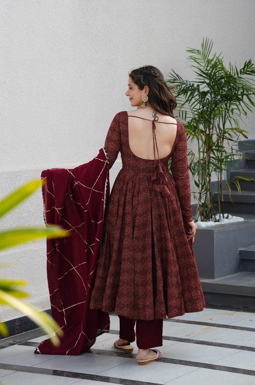💖 The Maroon Cotton Ajrakh Print Anarkali Suit combines heritage-inspired Ajrakh printing with a comfortable, modern silhouette, making it a versatile choice for both festive and casual occasions.