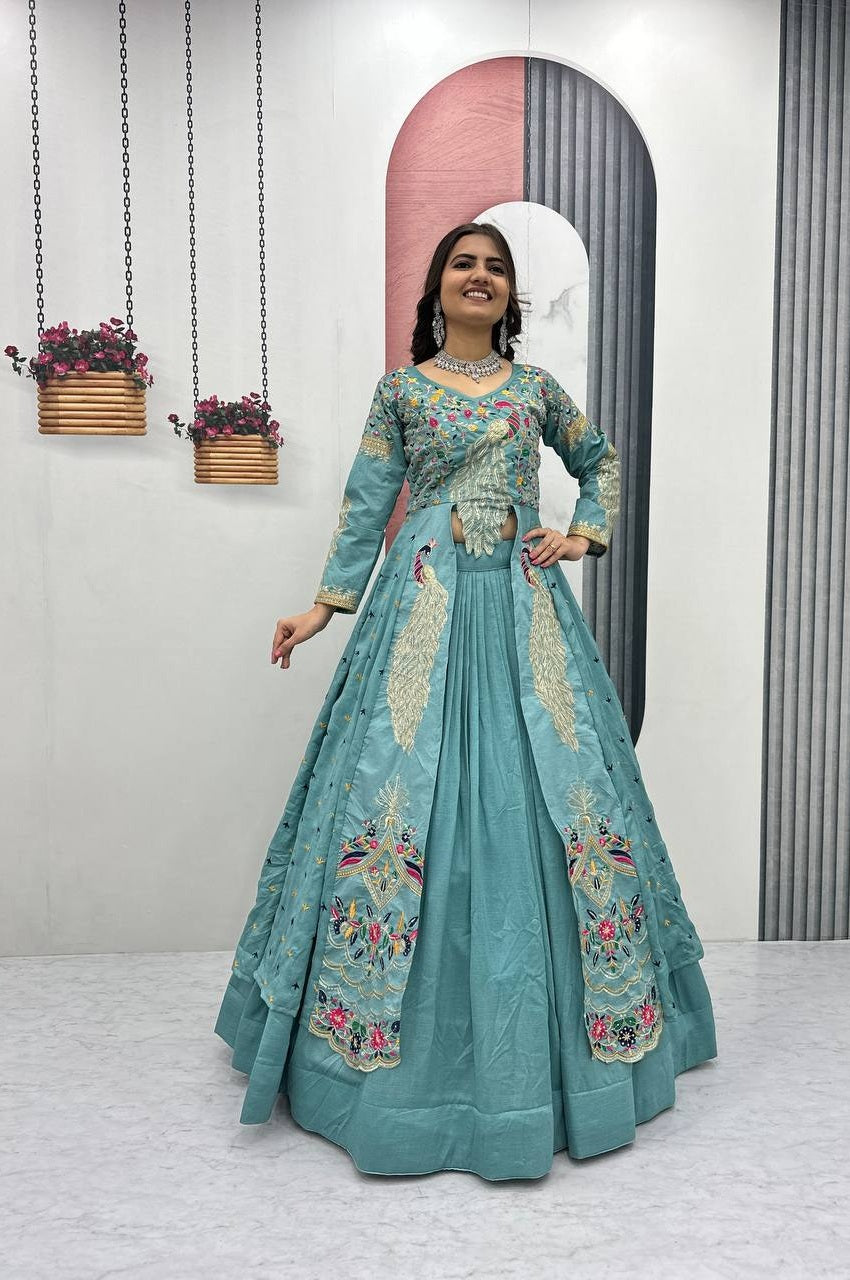 Make heads turn with this stunning Misty Teal Crop Top Lehenga Set, crafted in rich Pure Vichitra fabric and highlighted with heavy thread and sequence embroidery—perfect for festive nights, sangeet & party occasions.