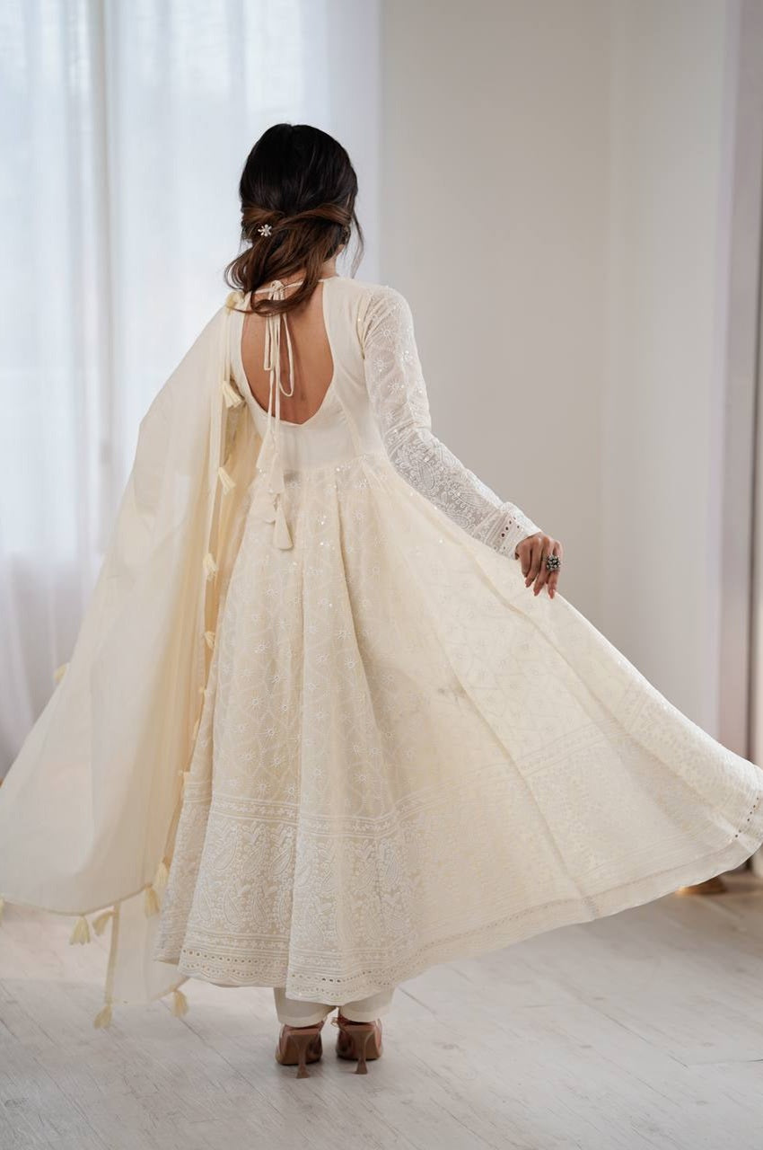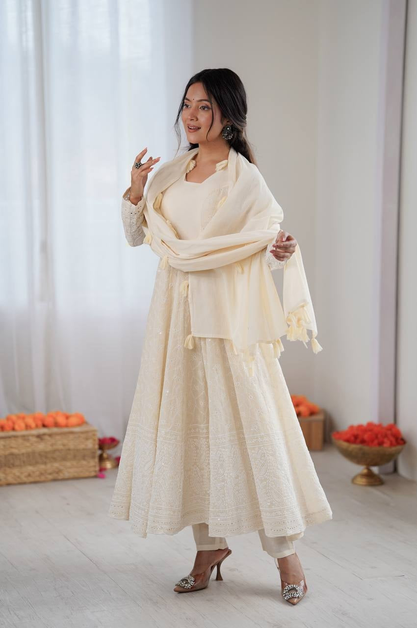 Step into classic sophistication with this beautifully crafted Off White Lucknowi Anarkali Suit Set, designed in pure Kora Cotton with delicate Schiffli work — perfect for festive occasions, family gatherings, and summer celebrations.