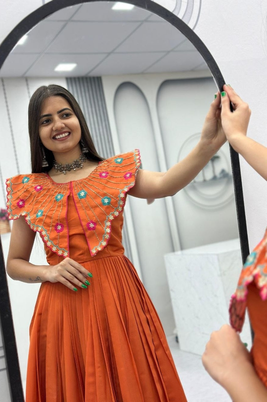 Pair this orange gown with gold or kundan jewellery and heels for a vibrant festive look. Add bold makeup and soft curls to enhance the royal appeal.