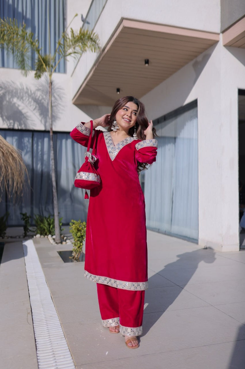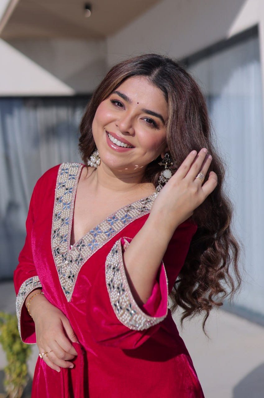 Step into timeless luxury with this Rani Pink Velvet Suit Set, crafted from premium 9000 Velvet and adorned with rich Zari embroidery and real mirror work. Designed to deliver a regal look with modern comfort, this ensemble is perfect for weddings, festive evenings, and grand celebrations.