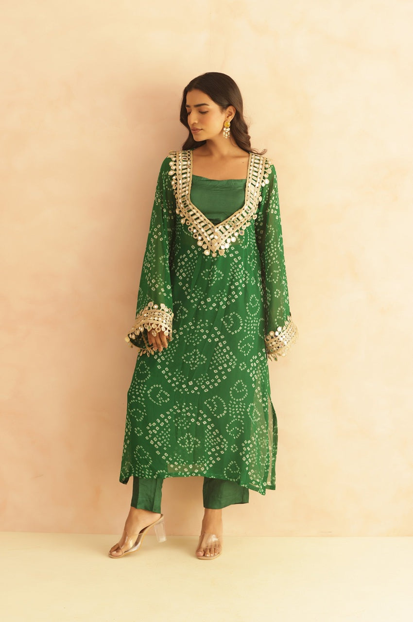 Step into elegance with this beautiful green designer wear crafted in premium Georgette fabric. Featuring a graceful Anarkali-style side-cut kurti, this ensemble exudes sophistication with every swirl.