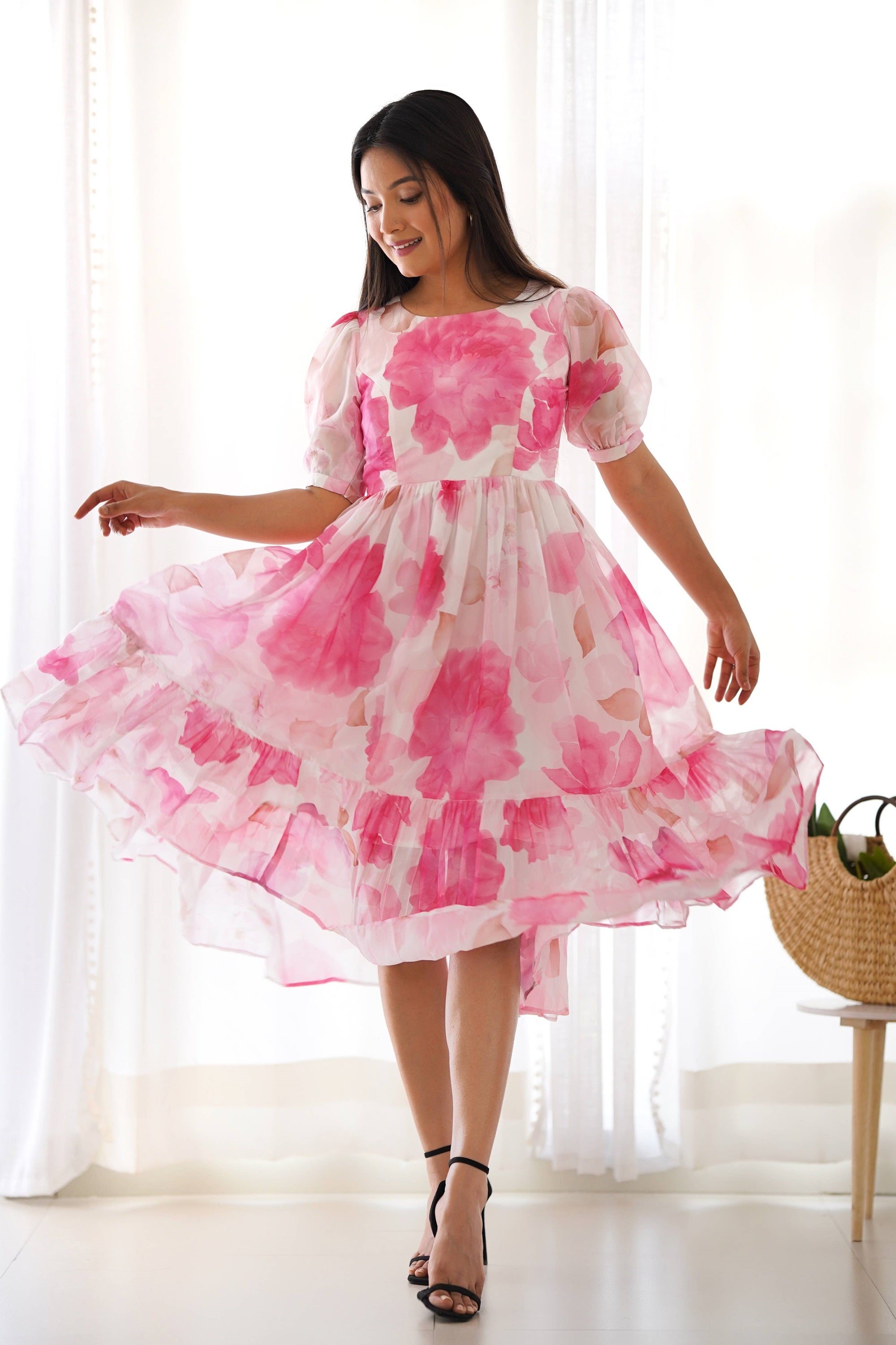 Step into elegance with our Elegant White Georgette One-Piece Dress with a Pink Floral Print.Crafted from premium soft organza silk., this beautiful dress offers comfort and style, making it perfect for any occasion.