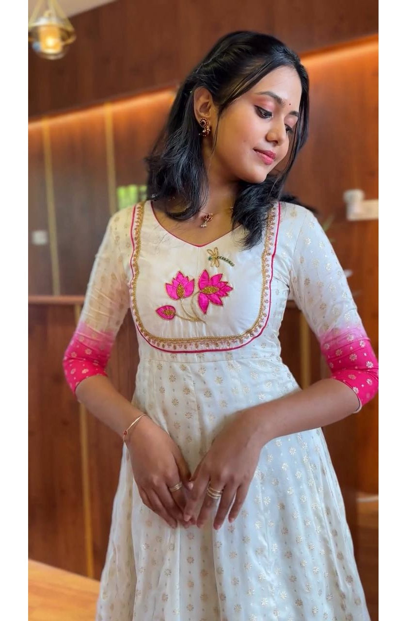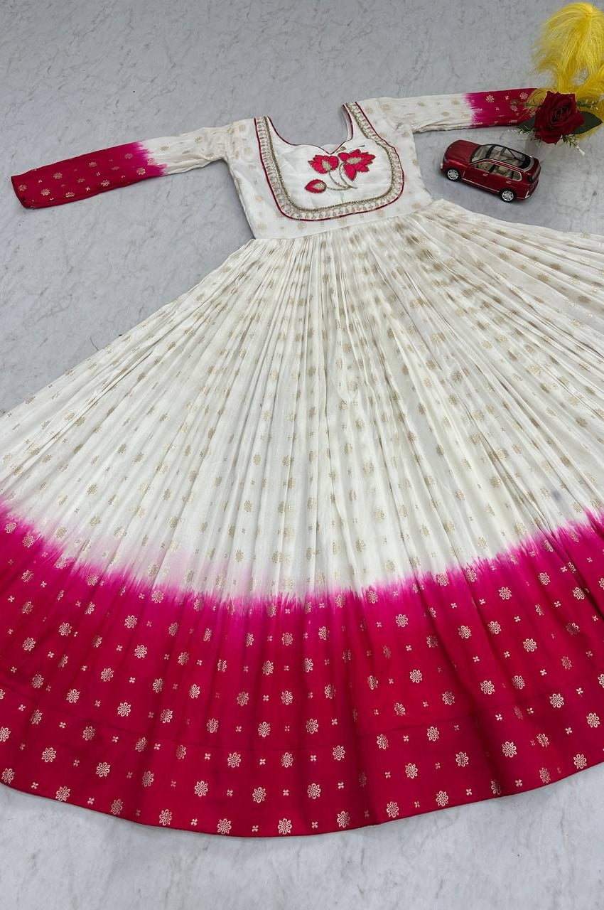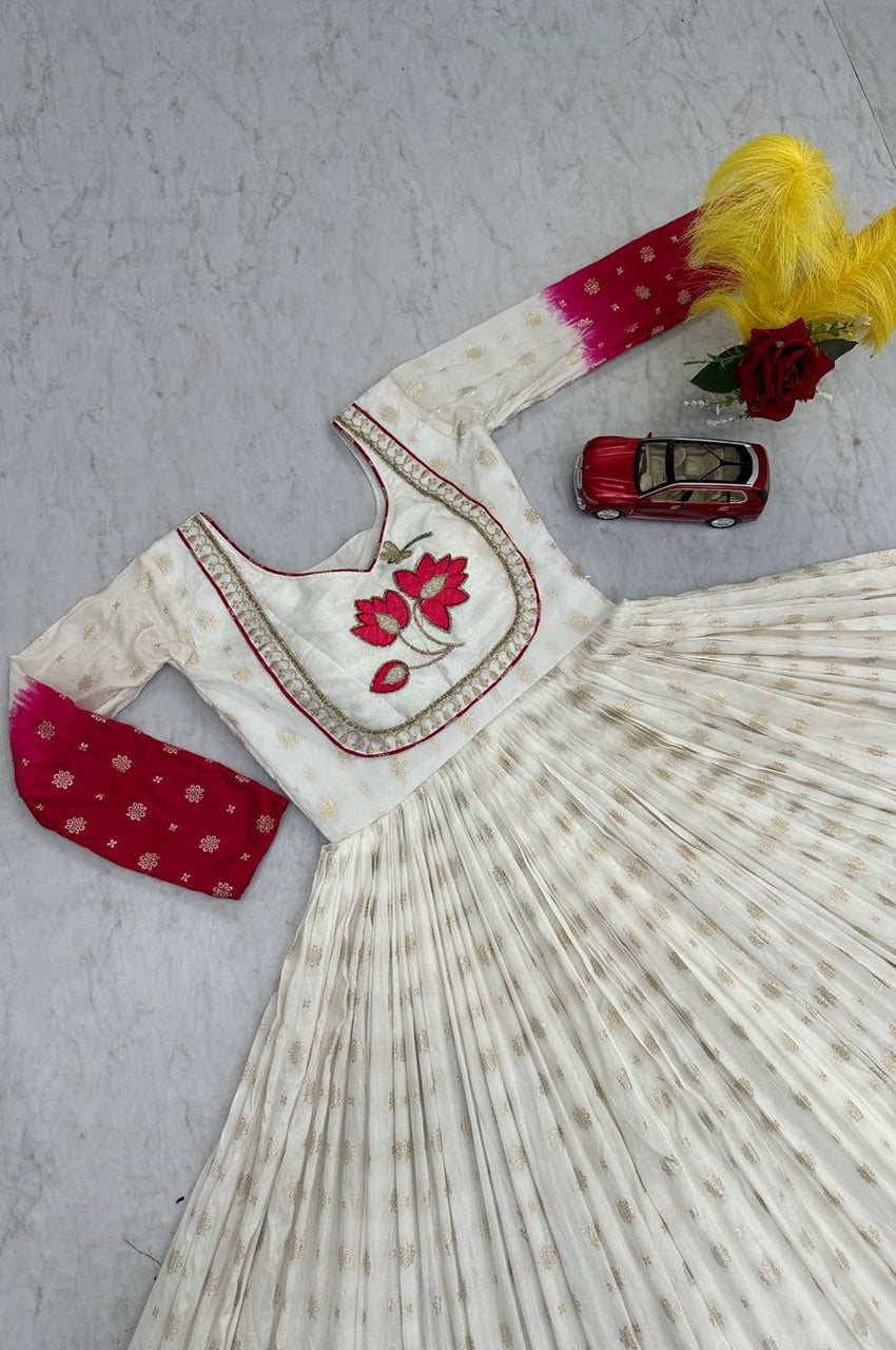 Elevate your ethnic charm with this luxurious White Zari Weaving Gown, crafted from premium Jacquard Silk. Featuring rich zari weaving and a beautifully flowing silhouette, this gown is perfect for festive celebrations, parties, and special occasions. Designed for comfort with a soft inner lining and generous flare, it delivers both style and sophistication.