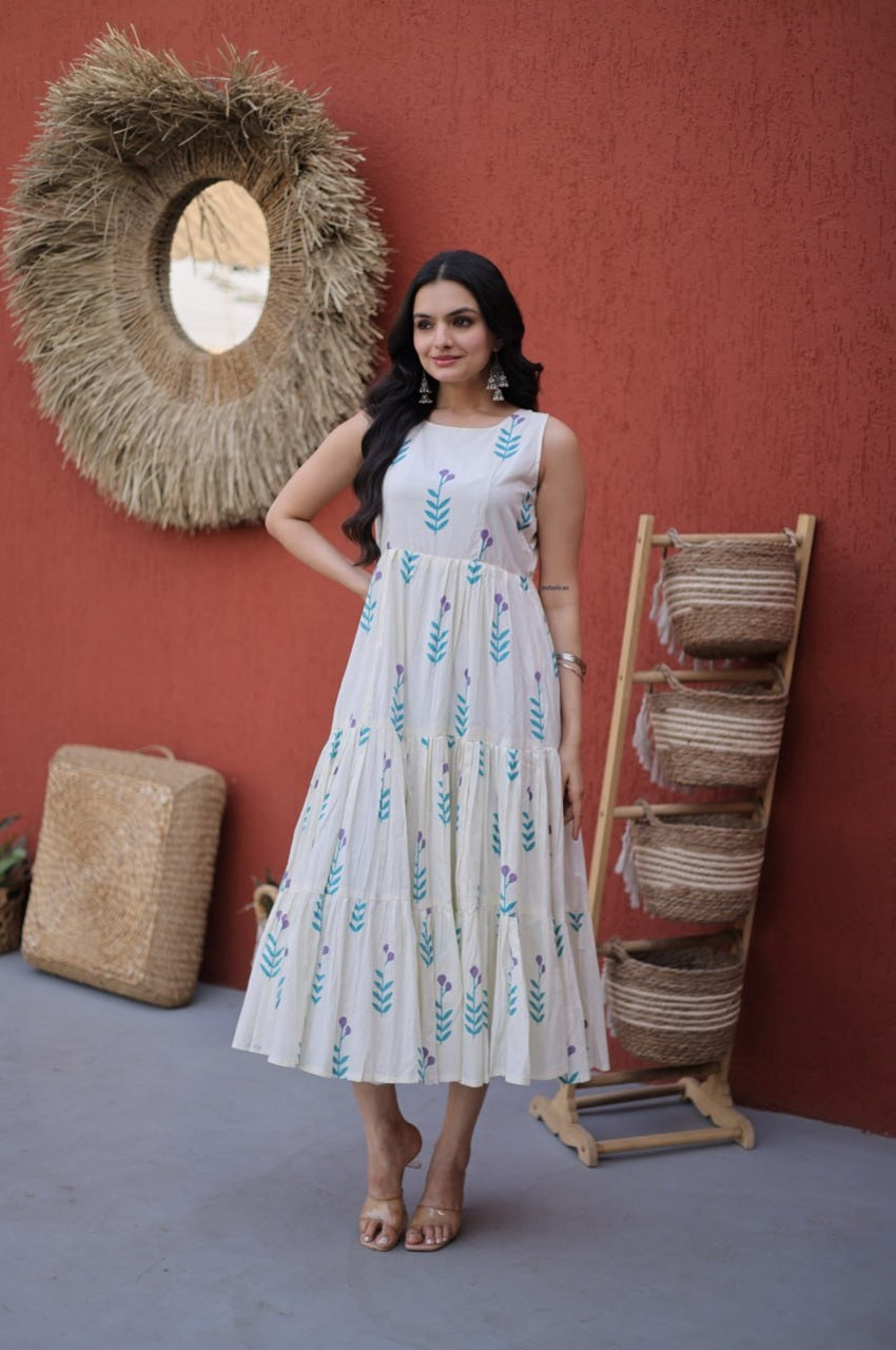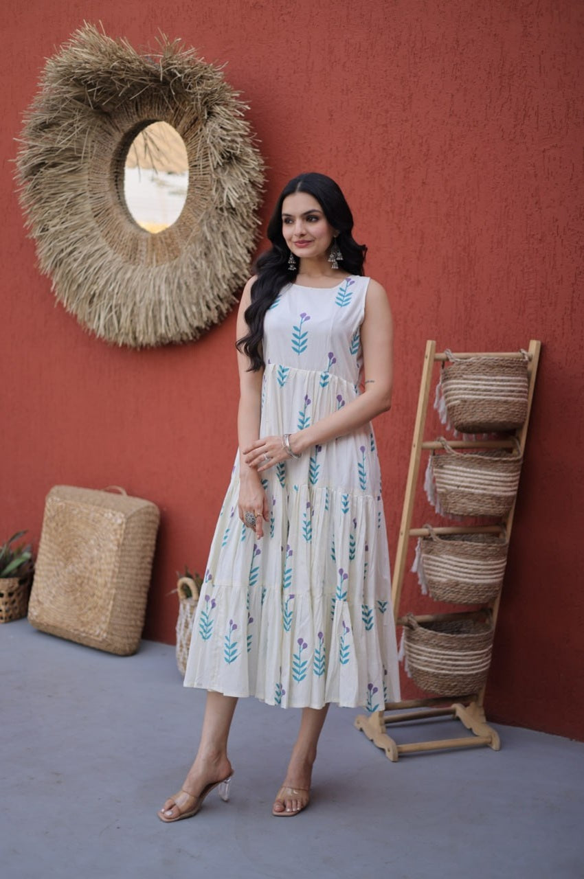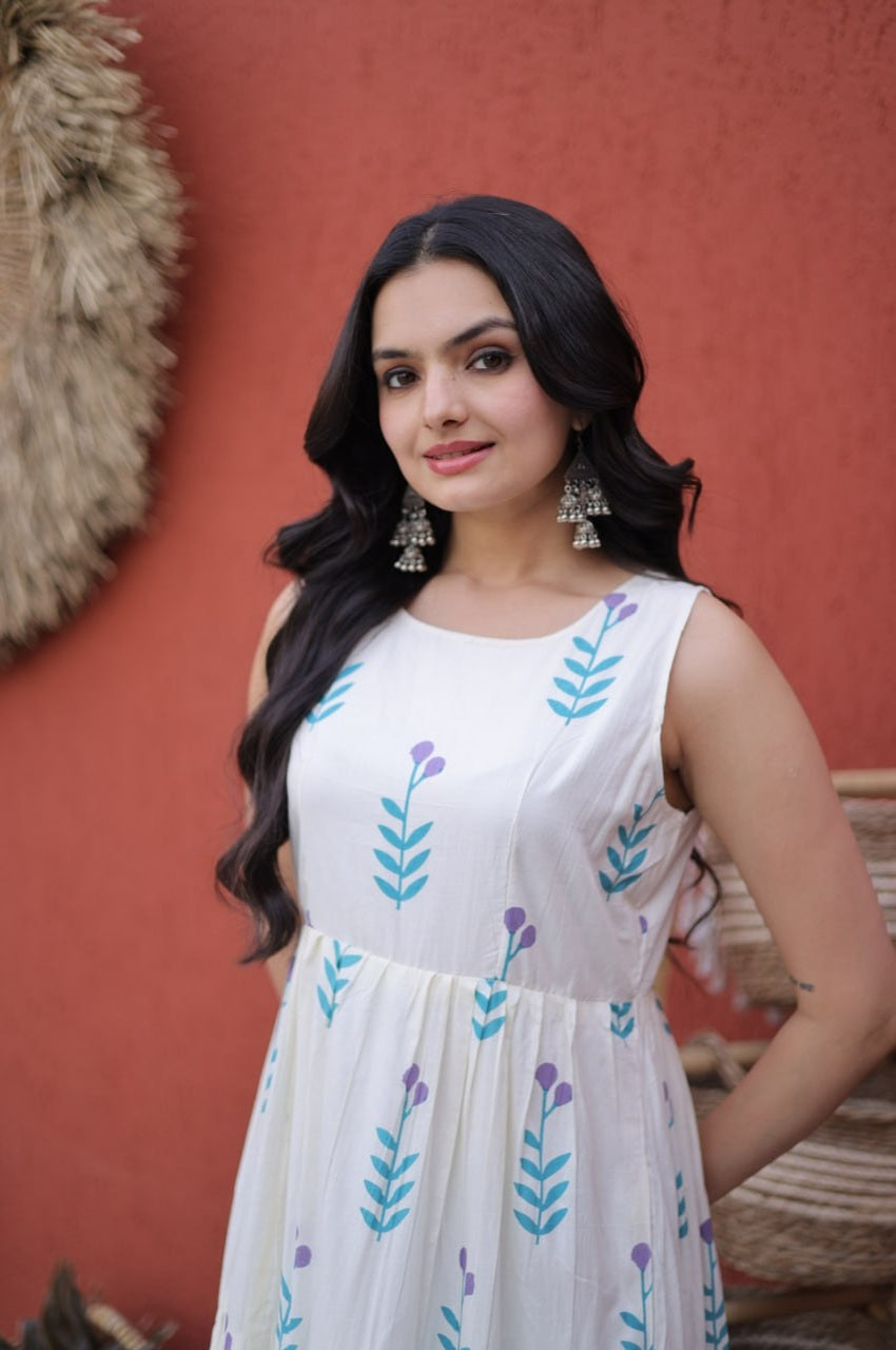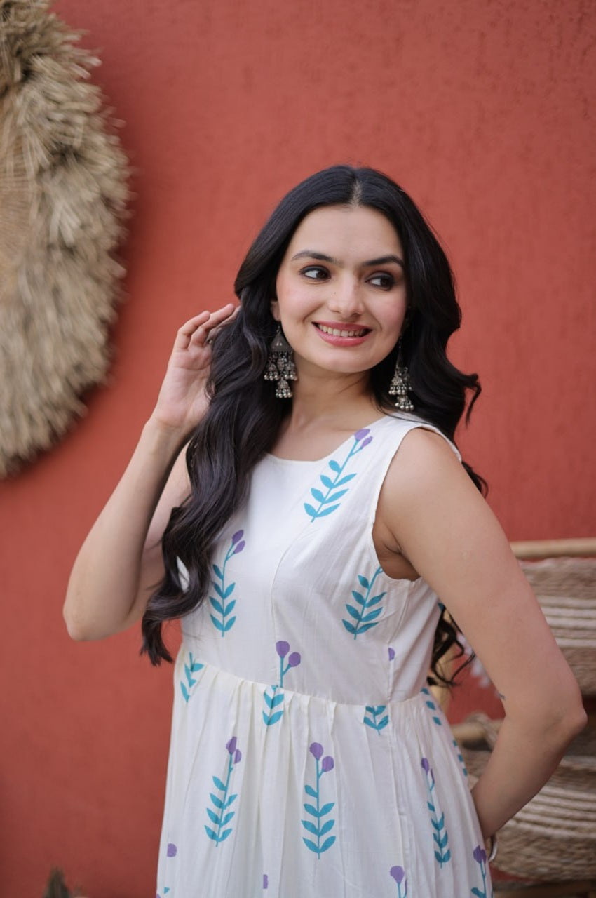 Style this white floral Anarkali kurti with minimal jewellery and flats for a fresh daytime look. Add oxidised earrings and a sling bag for a trendy casual vibe.